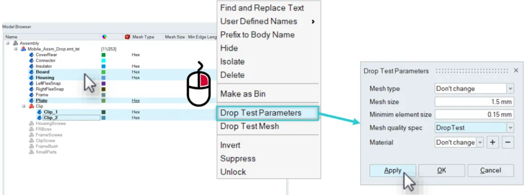 模擬工程師既可以在前期利用網格模版快速自動進行幾何清理和網格劃分,也可以在後續的 DropTest 工具中通過 Drop Test Parameter 給定網格參數進行劃分(見採用 SimLab 內置的 DropTest 工具進行快速設置),無論是哪種方式,都是快速自動操作,效率很高。