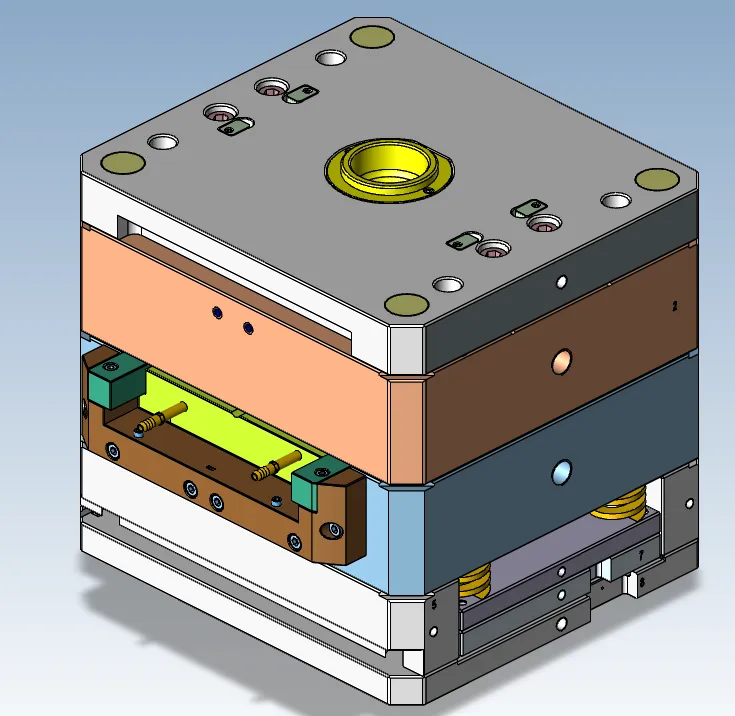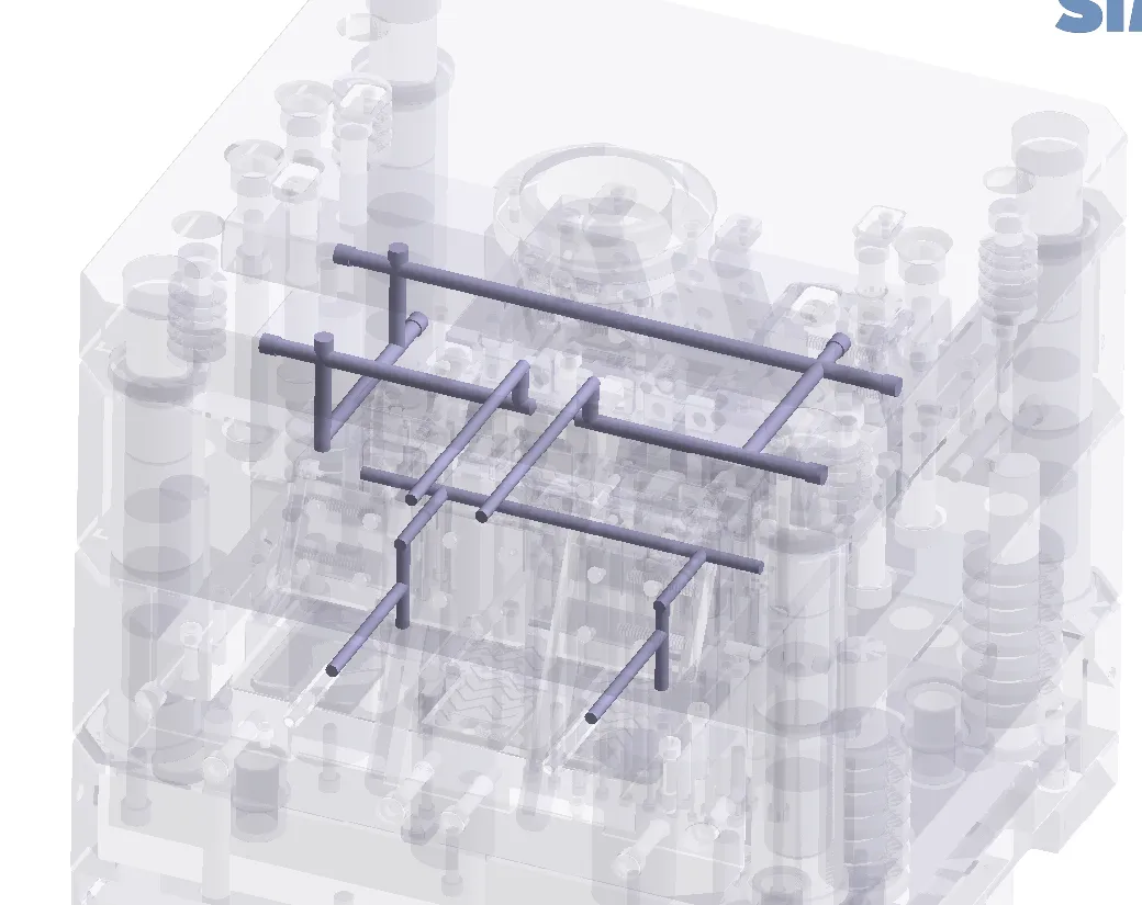 以上面的模具為例,此模具在射出成型時需要90℃模溫,使用模溫機進行預熱和冷卻,冷卻水路如下所示: