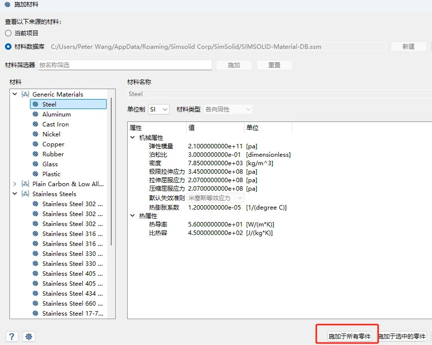 統一設置材質,對於個別零件如果有特殊材質,可以單獨選中定義材料。
