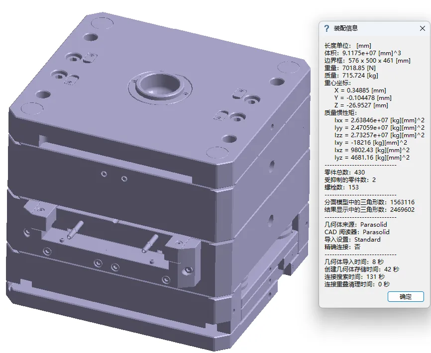 導入整套塑膠模具模型,所有模型不經過任何精簡或者處理,直接由 NX 導入到 SimSolid;合計零部件數目430個,抑制2個多餘的小體積零件,自動識別出螺栓153個。