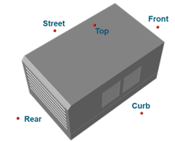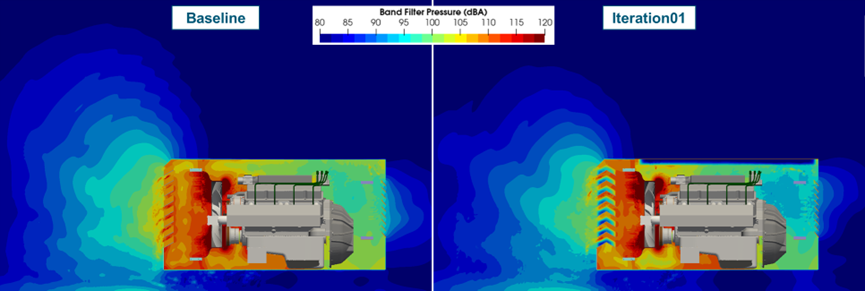 具有冷卻風扇的機器,外圍由隔音室覆蓋。本例驗證新設計人字型百葉窗及加裝頂部隔音棉能減少多少噪音值(圖七)。由分析結果可知新設計總聲壓級減少了3dB,並維持相同的冷卻氣流量(圖八)。由聲壓分布圖也可觀察到新設計的噪音影響範圍比原設計來的小,透過剖面圖也能得知實驗難以量測到的內部噪音值(圖九)。風扇本身是主要噪音來源,而從流場動畫可觀察到風扇氣流經過百葉窗後會形成許多渦流,這些渦流形成了氣動噪音的次要來源(圖十)。本案例前處理時間為4小時,分析時間僅需16小時。