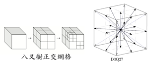 LBM網格為八叉樹正交網格(Octree-based Cartesian mesh),使用的元素類型為D3Q27元素,將3維流體粒子的速度離散為27個方向(圖三)。