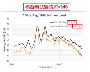 與試驗結果相比,模擬分析得到的平均風扇噪音聲壓級誤差僅相差不到3dB,如圖一所示。
