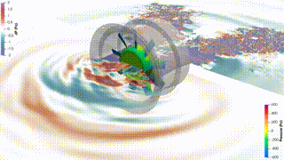 通過模擬風扇內部流場和外部聲場,預測噪音頻譜與聲壓級分佈,並與實驗數據進行驗證。結果顯示,數值模擬能有效捕捉主要噪音源和頻率特徵,模擬值與實測值的誤差在3dB內(圖五)。而從後處理可以觀察氣流經葉片的擾動情況以及聲波的傳播情況(圖六)。本案例分析時間僅需25小時。