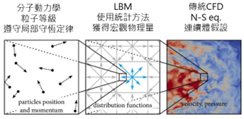 ultraFluidX使用LBM晶格波茲曼法(Lattice Boltzmann method),與傳統CFD使用連續體假設的Navier-Stokes equation不同,LBM介於宏觀流體力學與微觀分子動力學之間,採用統計力學方法獲得宏觀物理量,如圖二。