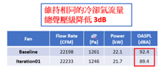 以下就幾個實際分析案例,說明ultraFluidX於伺服器軸流扇的噪音分析結果,以及進行設計改良,達到降低噪音,同時維持冷卻氣流的案例。